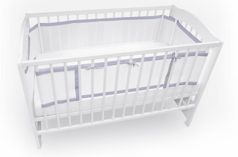 A baby protective and breathable fabric insert designed to cover the interior sides of a crib or cot. It is made from a soft material that allows for proper air circulation within the cot while preventing the baby from getting entangled in the crib's slats.