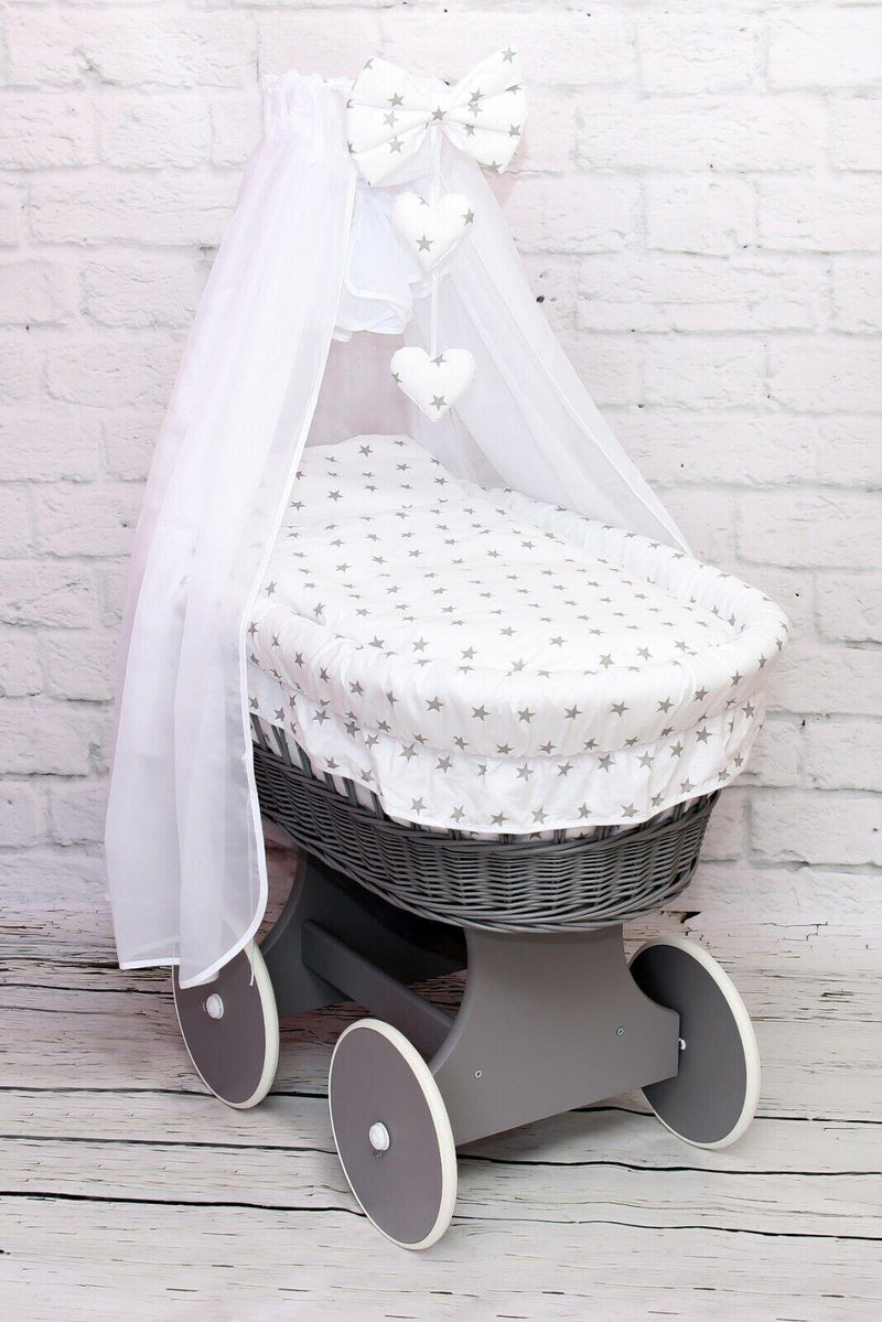 Grey Wicker Wheels Moses Basket Baby+Full Bedding Set Small grey stars on white