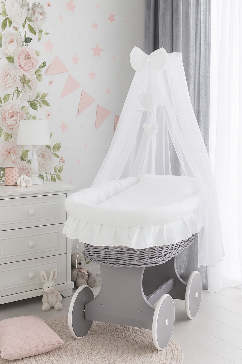 Grey Wicker Wheels Moses Basket Baby+Full Bedding Set White Cotton