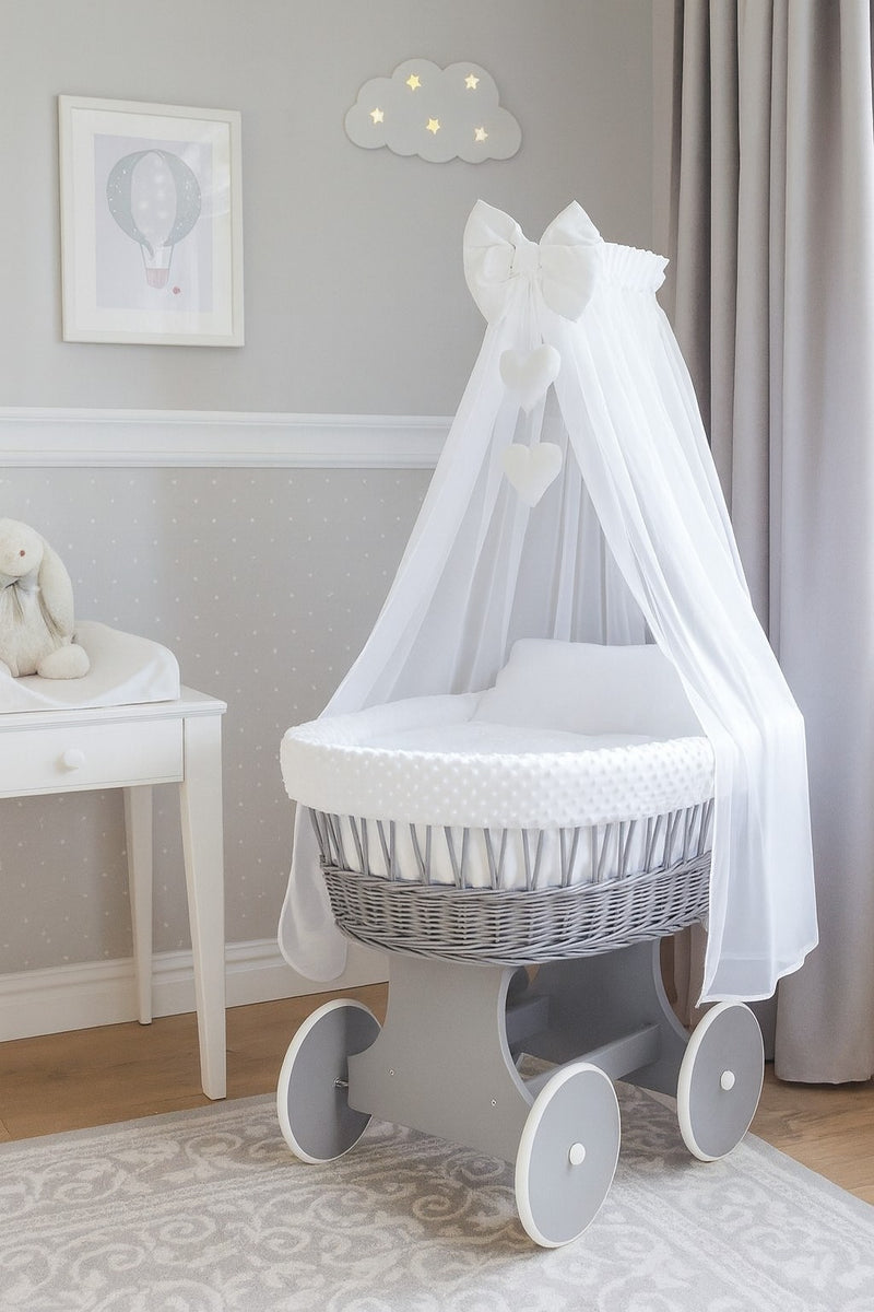 Grey Wicker Wheels Moses Basket Baby+Full Bedding Set White dimple