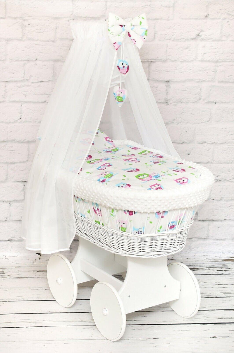 White Wicker Moses Basket with Wheels Baby+full Bedding Set Owls white dimple