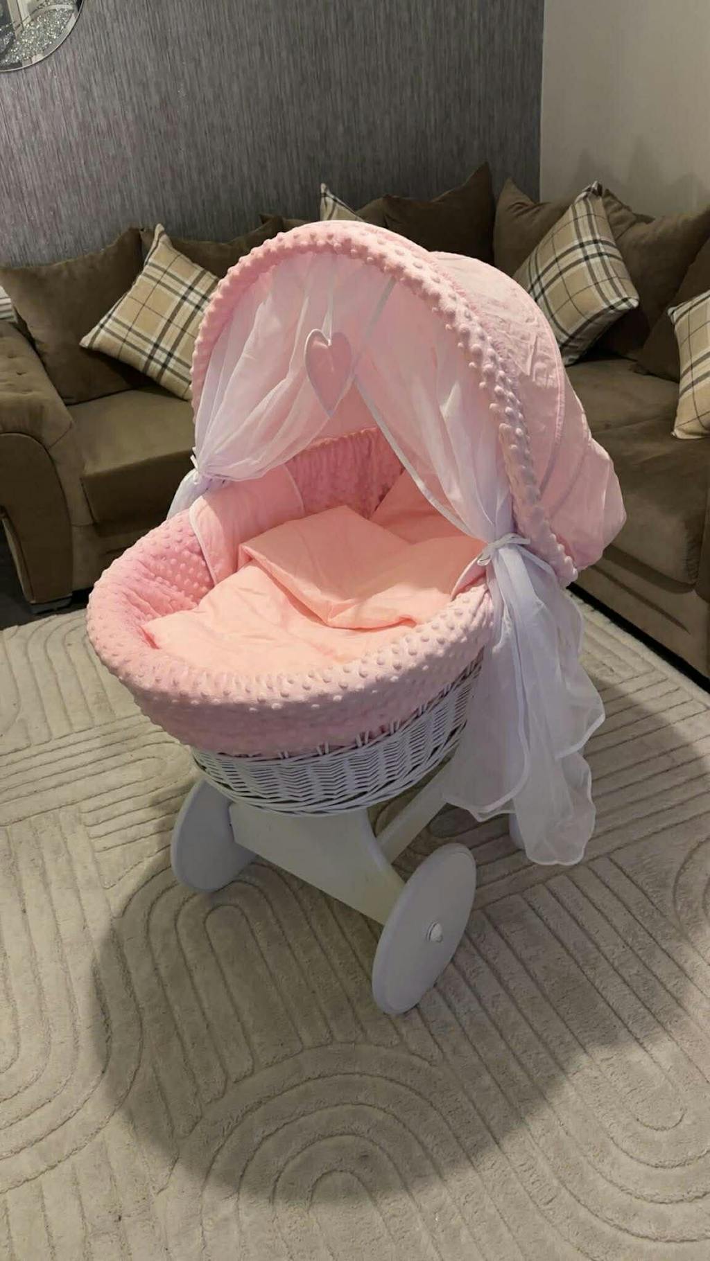 White Wicker Baby Moses Basket Wheels Pink Dimple Bedding
